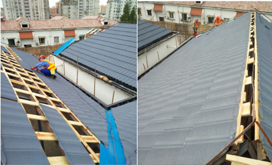 Stone metal tile shop ridge tile installation, should follow the high frequency wind direction lap, and should fully cover the two slope stone metal tile, lap width should not be less than 50mm..