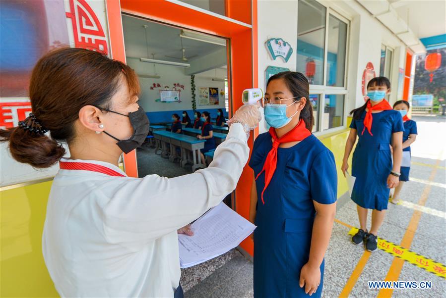 A teacher simulates checking the body temperatures of students during a drill at a primary school in Hanshan district of Handan, North Chinas Hebei province, May 31, 2020. [Photo/Xinhua]