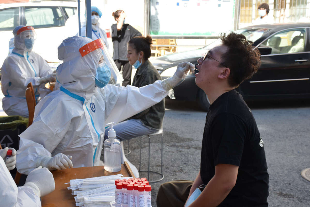 A medical worker collects a throat swab from a man at a nucleic acid testing site in Urumqi, Xinjiang Uygur autonomous region, on Aug 5, 2020. [Photo/Xinhua]